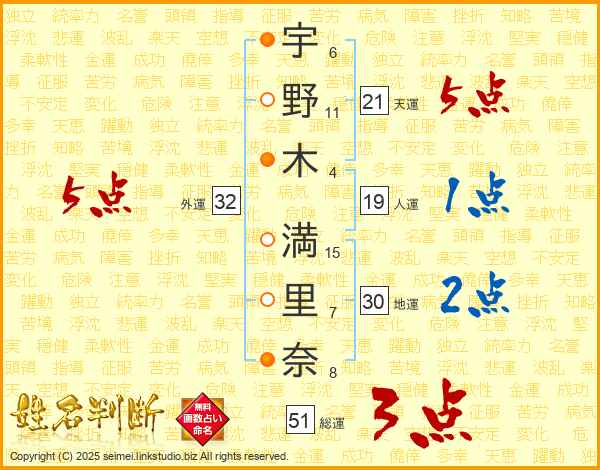 宇(6画)野(11画)木(4画) 満(15画)里(7画)奈(8画)