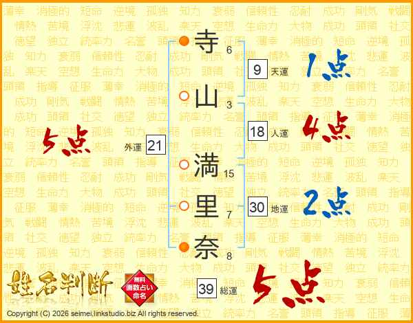 寺(6画)山(3画) 満(15画)里(7画)奈(8画)