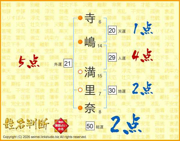 寺(6画)嶋(14画) 満(15画)里(7画)奈(8画)