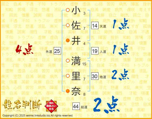 小(3画)佐(7画)井(4画) 満(15画)里(7画)奈(8画)