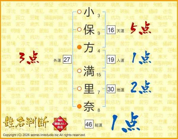 小(3画)保(9画)方(4画) 満(15画)里(7画)奈(8画)