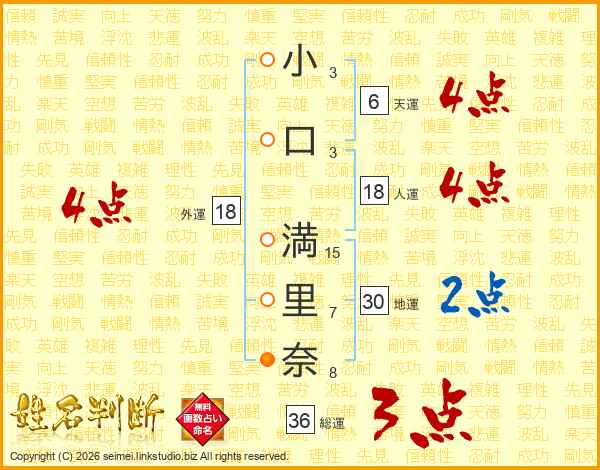 小(3画)口(3画) 満(15画)里(7画)奈(8画)