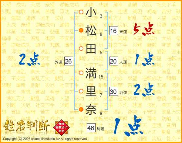 小(3画)松(8画)田(5画) 満(15画)里(7画)奈(8画)
