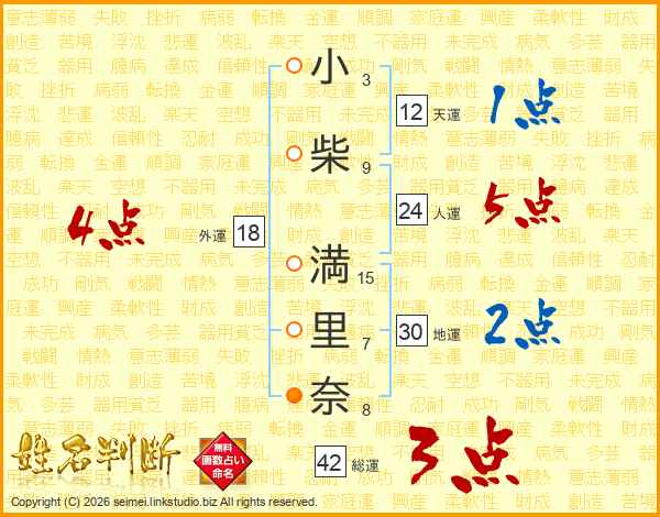 小(3画)柴(9画) 満(15画)里(7画)奈(8画)