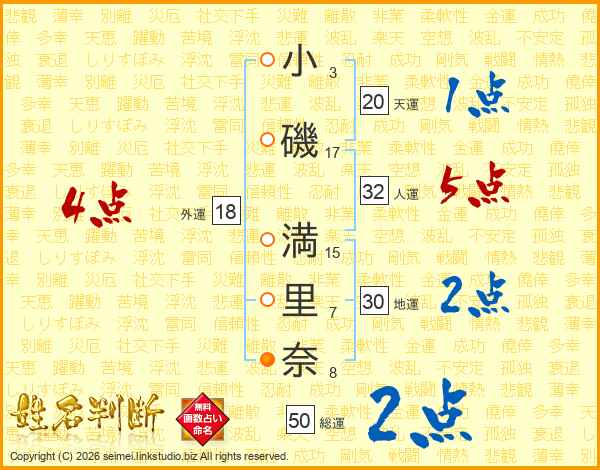 小(3画)磯(17画) 満(15画)里(7画)奈(8画)