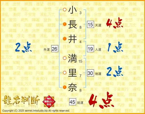 小(3画)長(8画)井(4画) 満(15画)里(7画)奈(8画)