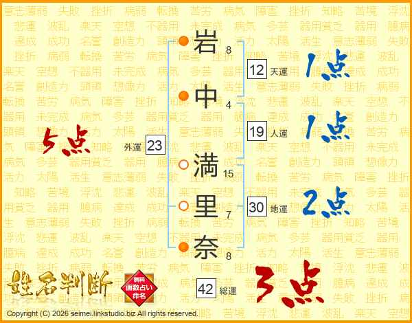 岩(8画)中(4画) 満(15画)里(7画)奈(8画)