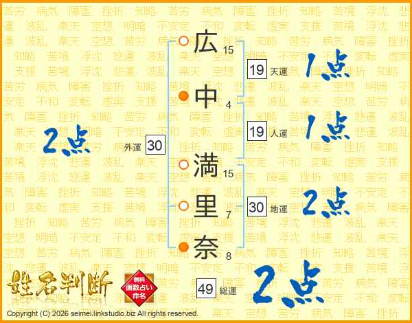 広(15画)中(4画) 満(15画)里(7画)奈(8画)