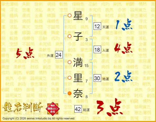星(9画)子(3画) 満(15画)里(7画)奈(8画)