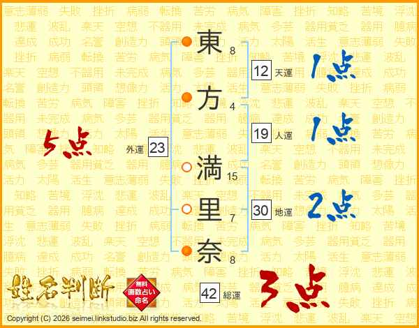 東(8画)方(4画) 満(15画)里(7画)奈(8画)