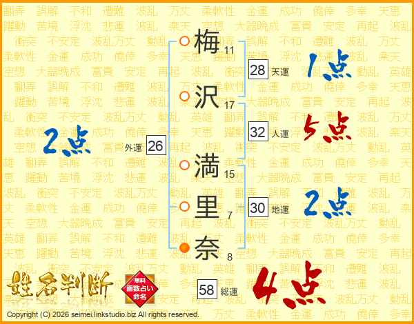 梅(11画)沢(17画) 満(15画)里(7画)奈(8画)