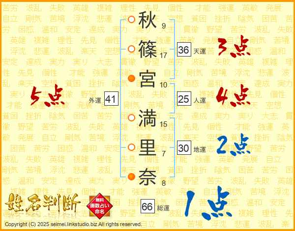 秋(9画)篠(17画)宮(10画) 満(15画)里(7画)奈(8画)