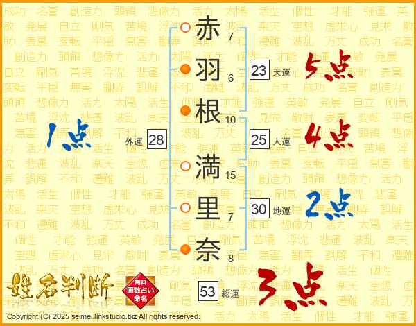 赤(7画)羽(6画)根(10画) 満(15画)里(7画)奈(8画)