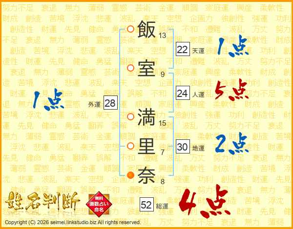 飯室満里奈さんの総運は52画の4点!