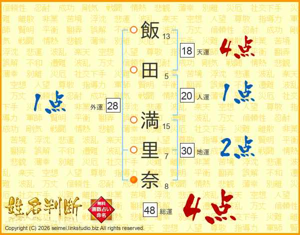 飯(13画)田(5画) 満(15画)里(7画)奈(8画)