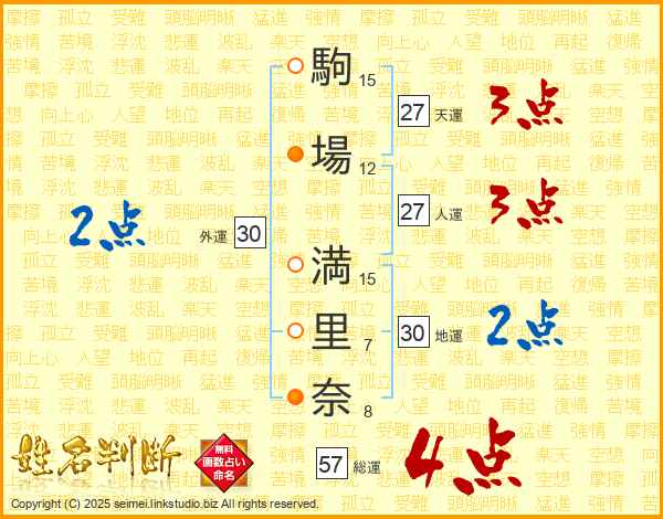 駒(15画)場(12画) 満(15画)里(7画)奈(8画)