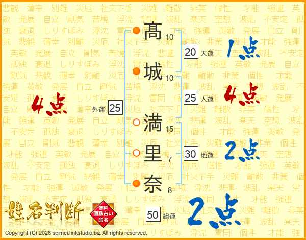 髙(10画)城(10画) 満(15画)里(7画)奈(8画)