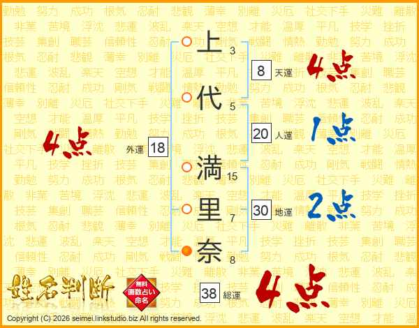 上(3画)代(5画) 満(15画)里(7画)奈(8画)