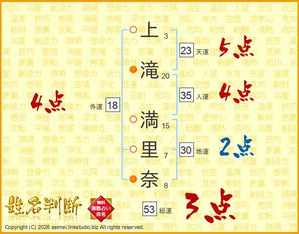 上(3画)滝(20画) 満(15画)里(7画)奈(8画)