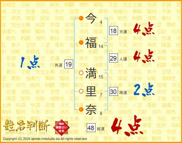 今(4画)福(14画) 満(15画)里(7画)奈(8画)