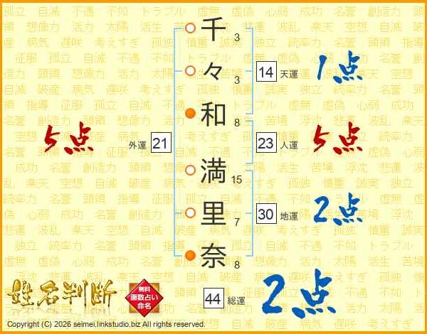 千(3画)々(3画)和(8画) 満(15画)里(7画)奈(8画)