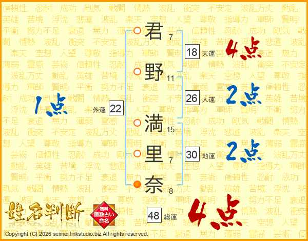 君(7画)野(11画) 満(15画)里(7画)奈(8画)