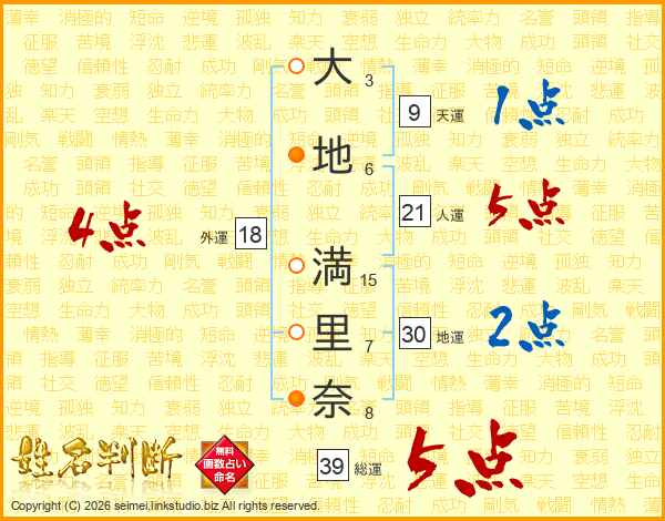 大(3画)地(6画) 満(15画)里(7画)奈(8画)