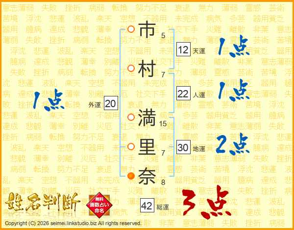 市(5画)村(7画) 満(15画)里(7画)奈(8画)