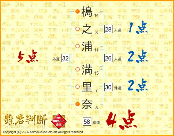 槝(14画)之(3画)浦(11画) 満(15画)里(7画)奈(8画)