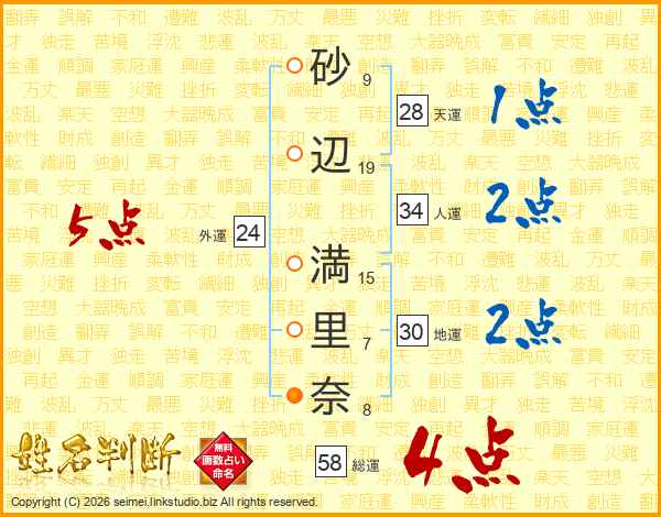 砂(9画)辺(19画) 満(15画)里(7画)奈(8画)