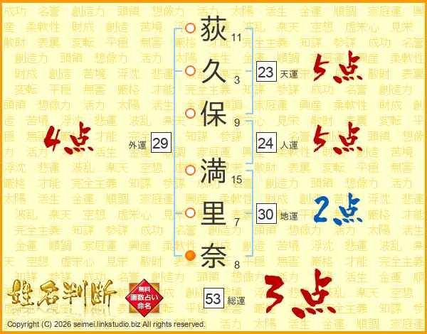 荻(11画)久(3画)保(9画) 満(15画)里(7画)奈(8画)