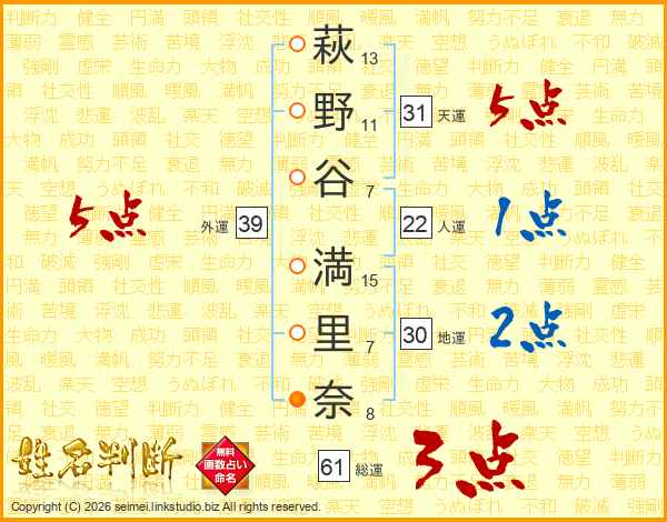 萩(13画)野(11画)谷(7画) 満(15画)里(7画)奈(8画)