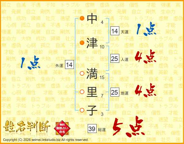 中(4画)津(10画) 満(15画)里(7画)子(3画)
