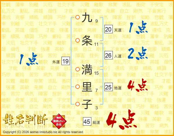 九(9画)条(11画) 満(15画)里(7画)子(3画)