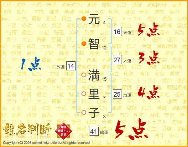 元(4画)智(12画) 満(15画)里(7画)子(3画)