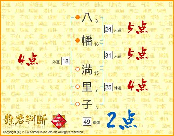 八(8画)幡(16画) 満(15画)里(7画)子(3画)