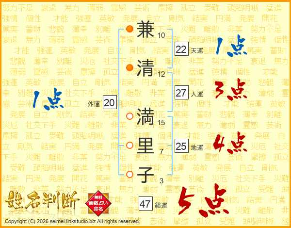 兼(10画)清(12画) 満(15画)里(7画)子(3画)
