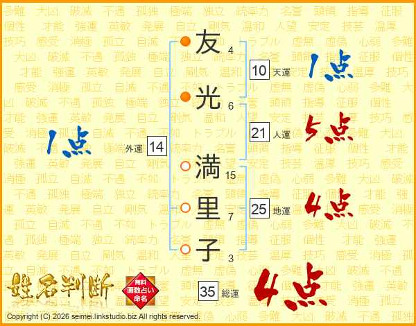 友(4画)光(6画) 満(15画)里(7画)子(3画)