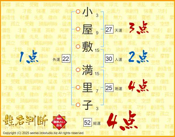 小屋敷満里子さんの総運は52画の4点!