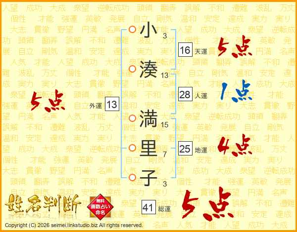 小(3画)湊(13画) 満(15画)里(7画)子(3画)