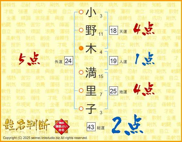 小(3画)野(11画)木(4画) 満(15画)里(7画)子(3画)
