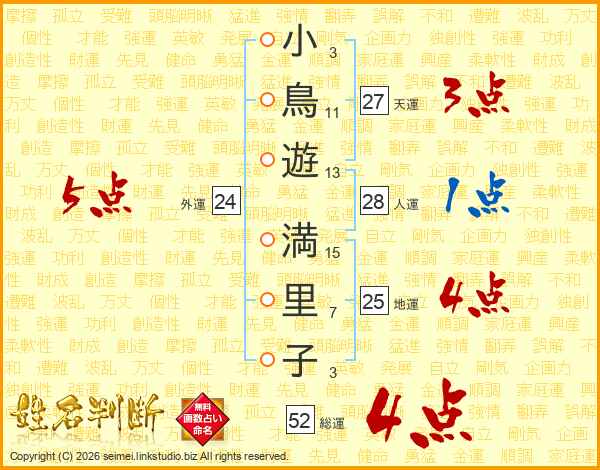 小鳥遊満里子さんの総運は52画の4点!