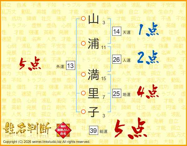 山(3画)浦(11画) 満(15画)里(7画)子(3画)