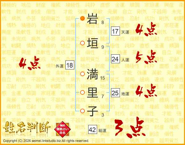 岩(8画)垣(9画) 満(15画)里(7画)子(3画)