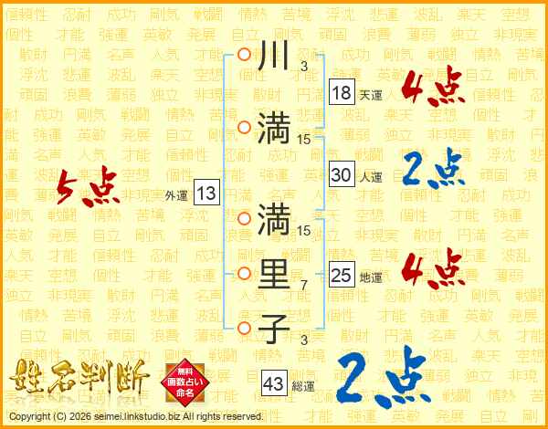川(3画)満(15画)  満(15画)里(7画)子(3画)