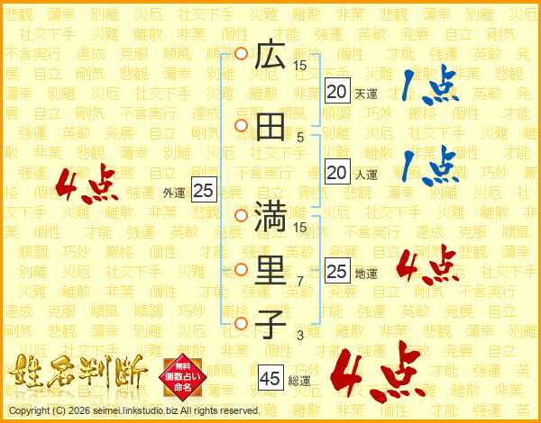 広(15画)田(5画) 満(15画)里(7画)子(3画)