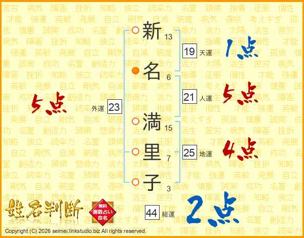 新(13画)名(6画) 満(15画)里(7画)子(3画)