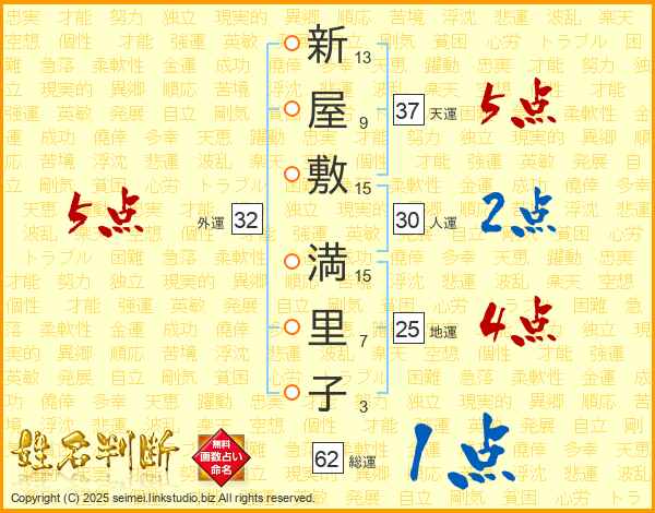 新(13画)屋(9画)敷(15画) 満(15画)里(7画)子(3画)