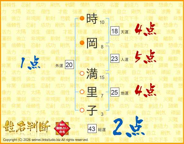 時(10画)岡(8画) 満(15画)里(7画)子(3画)