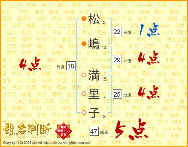 松(8画)嶋(14画) 満(15画)里(7画)子(3画)